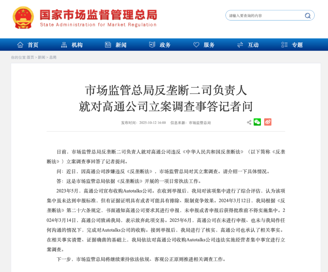 2023年5月,高通公司宣布收购Autotalks公司。在收到举报后,我局对该项集中进行了综合评估,认为该项集中虽未达到申报标准,但有证据证明具有或者可能具有排除、限制竞争效果。2024年3月12日,我局根据《反垄断法》第二十六条规定,书面通知高通公司要求其进行申报,未申报或者申报后获得批准前不得实施集中。2024年3月14日,高通公司致函我局,表示放弃此项交易。2025年6月,高通公司在未进行申报、也未与我局作任何沟通的情况下,完成对Autotalks公司的收购。接到举报后,我局进行了核实,高通公司也承认了相关事实。在相关事实清楚、证据确凿的基础上,我局依法对高通公司收购Autotalks公司违法实施经营者集中事宜进行立案调查。