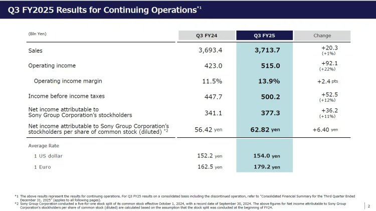 索尼集团发布2025财年第三季度财报 营业利润同比增长22% 全年预期上调