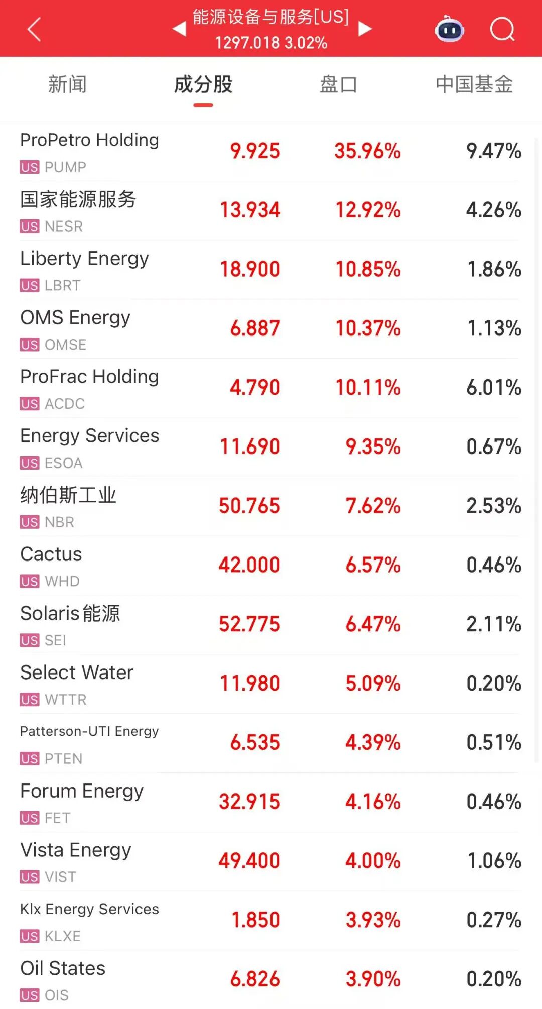 能源设备与服务板块,多股上涨。截至发稿,ProPetro Holding涨超35%,Liberty Energy、OMS Energy等涨超10%。