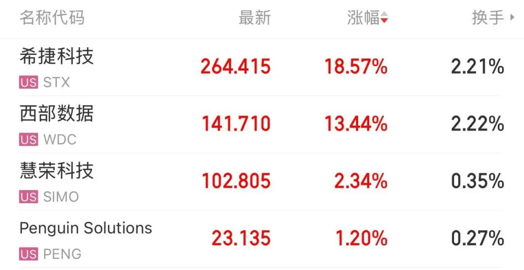 海外存储芯片板块,继续联袂大涨。截至发稿,希捷科技涨超18%,西部数据涨超13%,美光科技涨近4%。