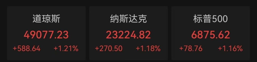 截至当地时间1月21日收盘,美国三大股指全线上涨。Wind数据显示,道指涨1.21%,标普500指数涨1.16%,纳指涨1.18%。