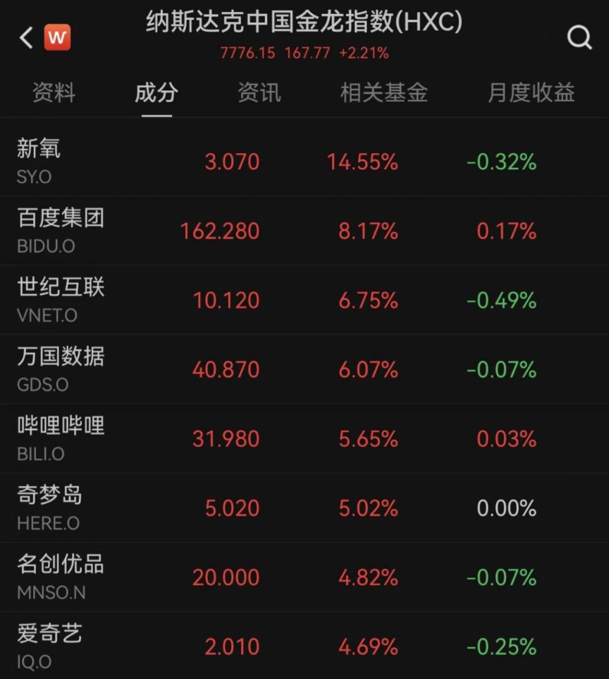 中概股普遍上涨,纳斯达克中国金龙指数涨2.21%,万得中概科技龙头指数涨1.81%。个股方面,新氧涨超14%,百度集团涨逾8%,世纪互联、万国数据均涨超6%。