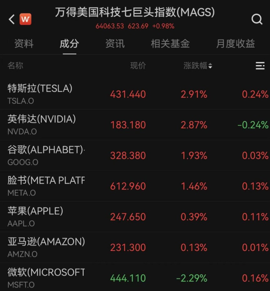 美国大型科技股多数上涨,万得美国科技七巨头指数上涨0.98%。特斯拉、英伟达均涨超2%,谷歌涨近2%,META涨超1%,苹果涨0.39%,亚马逊涨0.13%,微软跌超2%。