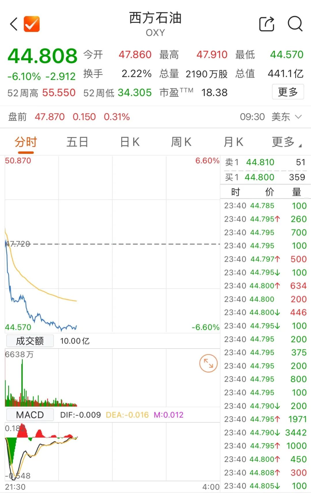 西方石油跌超6%。据美国媒体报道,美国知名投资人巴菲特旗下的伯克希尔·哈撒韦公司正在耗资100亿美元,收购西方石油公司旗下的一家子公司。若交易最终达成,这将是伯克希尔自2022年以来金额最高的一笔收购。