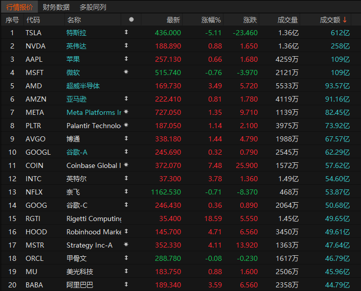 第5名AMD收高3.49%,成交93.57亿美元。据报道,英特尔正在与AMD成为其代工客户进行早期谈判。该报道援引“知情人士”的话曝光了上述信息,但并未说明AMD有多少芯片制造将转移到英特尔。