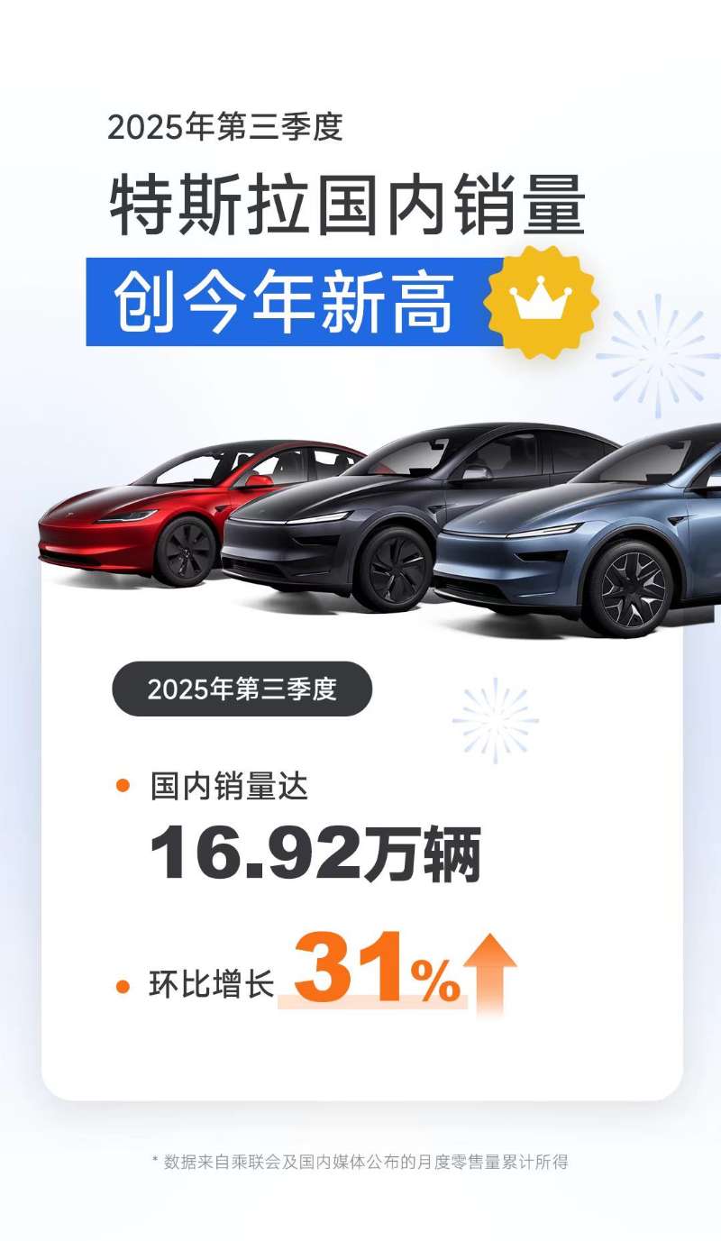 数据还显示,第三季度,特斯拉在中国市场9月销量为7.1万辆,环比增长25%,Model Y为SUV销量第一名。第三季度,特斯拉在中国市场销量近17万辆,环比增长31%。
