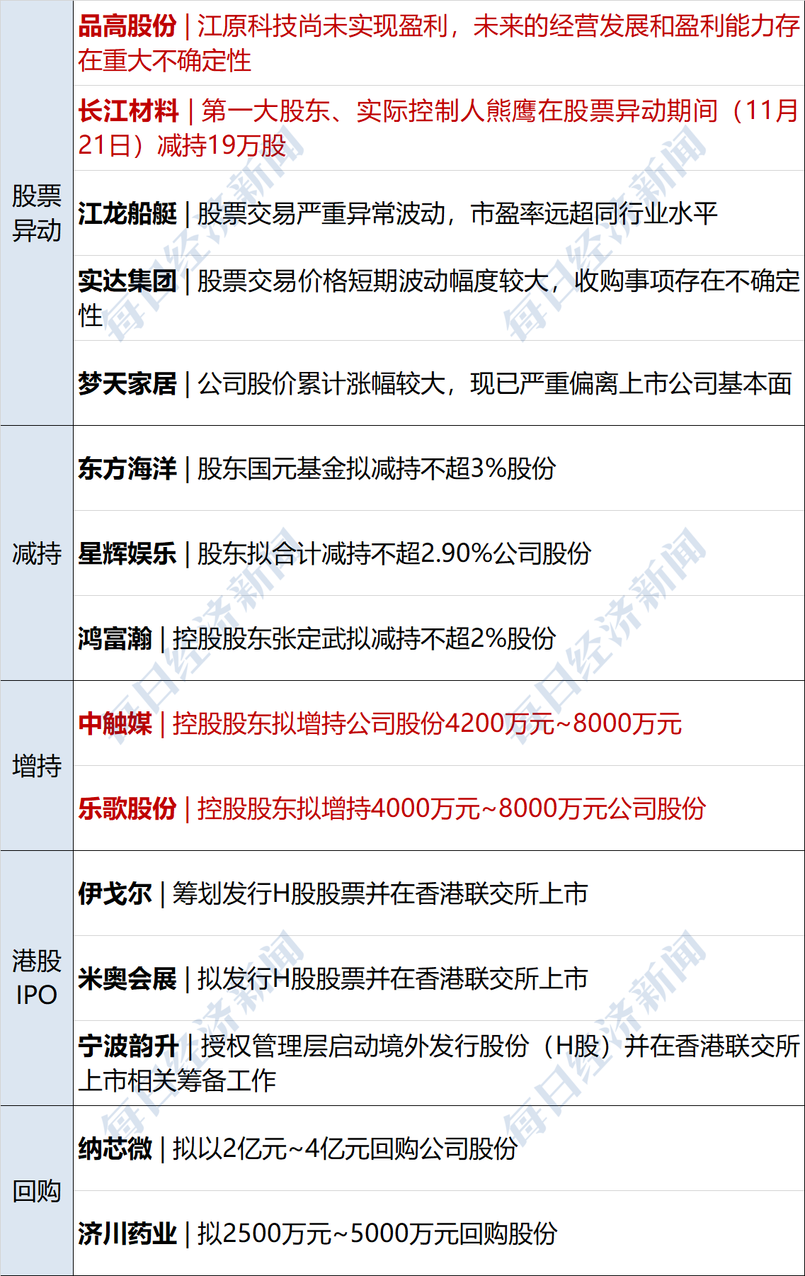 小米集团(HK01810,股价18.66港元,市值1.01万亿港元):11月24日,小米集团于港交所发布公告表示,小米集团创始人、董事长兼CEO雷军个人斥资超1亿港元增持小米集团260万股,雷军持股比例增加至23.26%。本月,小米集团已分别于20日和21日连续两日回购公司股票2150万股,总斥资金额超8亿港币。