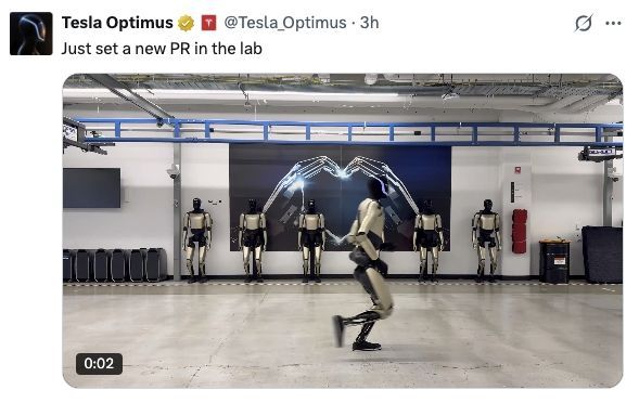 南方财经12月3日电,据界面新闻,北京时间12月3日,特斯拉CEO马斯克在社交平台X转发特斯拉擎天柱(Optimus)团队发布一段“擎天柱”人形机器人跑步的短视频。该团队配文称:刚在实验室刷新了个人纪录(PR,Personal Record)。