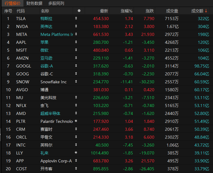 第17名英特尔收跌7.45%,成交43.72亿美元。英特尔周三表示,经过策略评估后,已决定保留旗下网络与通讯部门(NEX),不再推动出售或分拆计划。这项决定显示公司在财务情况改善后,对该业务的长期布局出现转向。英特尔说明,整合网通资产有助于强化硅晶、软件与系统之间的协同效应,进一步提升在AI、数据中心与边缘运算等领域的整体产品竞争力。作为此次举措的一部分,英特尔终止和爱立信谈判,此前后者曾讨论过收购NEX的股份。