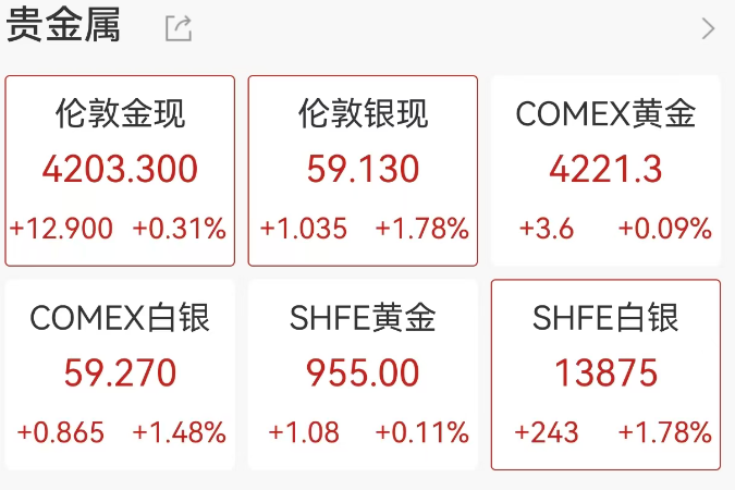 商品方面,国际贵金属价格剧烈波动,COMEX黄金一度失守4200美元大关,随后震荡回升,截至22:46报价4221美元,现货黄金报4203美元;白银涨幅明显,现货白银和COMEX白银均涨超1.4%。