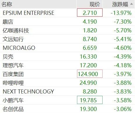 中概股普跌 趣店跌超7% 理想汽车、百度跌超4%