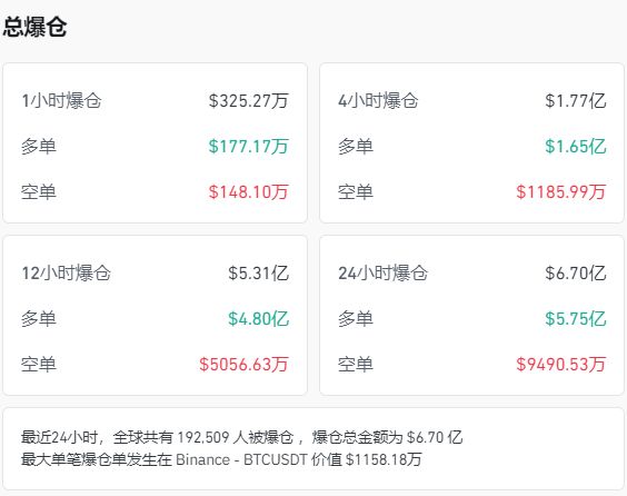 coinglass数据显示,24小时超19万人爆仓,6.70亿美元(约合人民币47亿元)灰飞烟灭。
