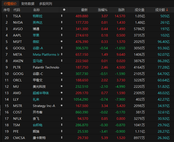 第3名博通收高0.44%,成交197亿美元。中信证券维持博通增持评级,目标价450美元:公司当季营收及下季指引超预期,AI业务增速亮眼,积压订单达730亿美元,新增大额订单。虽因AI成本上升致毛利率承压,但ASIC、Tomahawk 6放量及VMware合作深化将推动非AI业务复苏。基于FY2026年42x PE估值,上调目标价至450美元。