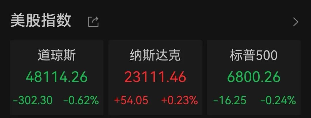 当地时间12月16日,美股三大股指涨跌不一。截至收盘,道指、标普500指数分别下跌0.62%、0.24%,纳指涨0.23%。