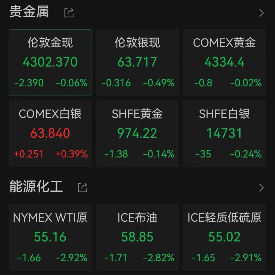 Wind数据显示,截至北京时间12月17日5:55,COMEX黄金期货价格跌0.02%,报4334.4美元/盎司;NYMEX原油期货主力合约、ICE布油期货主力合约双双跌近3%,分别报55.16美元/桶和58.85美元/桶,均创5月以来阶段新低。
