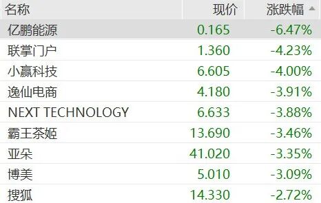 热门中概股多数下跌,纳斯达克中国金龙指数跌0.34%,亿鹏能源跌6.5%,联掌门户、小赢科技涨跌超4%,拼多多、网易跌超1%;上涨方面,叮咚买菜涨超11%,小马智行涨超7%,知乎涨超3%。