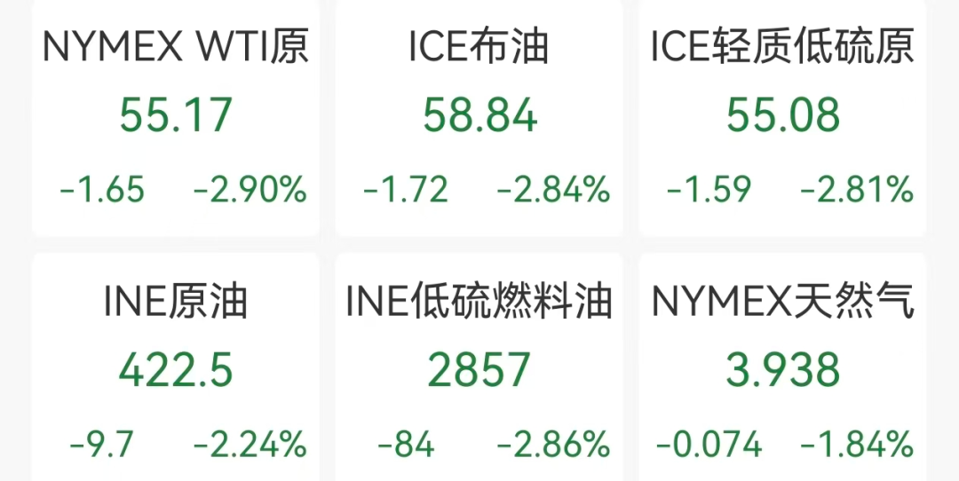 商品方面,原油市场暴跌,WTI原油期货一度失守55美元/桶,为2021年2月以来首次。截至收盘,WTI原油、ICE布油均收跌超2.8%。