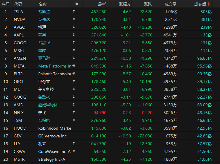第3名博通收跌4.48%,成交239亿美元。该股本周迄今已下跌9.4%,12月迄今已下跌超过19%。