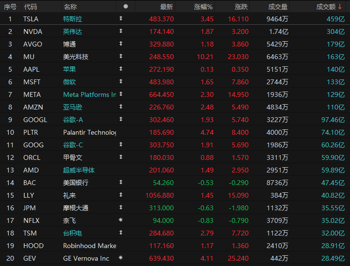 美股成交额前20:美光科技涨超10% 公司财报显示其存储芯片需求强劲且远超市场预期