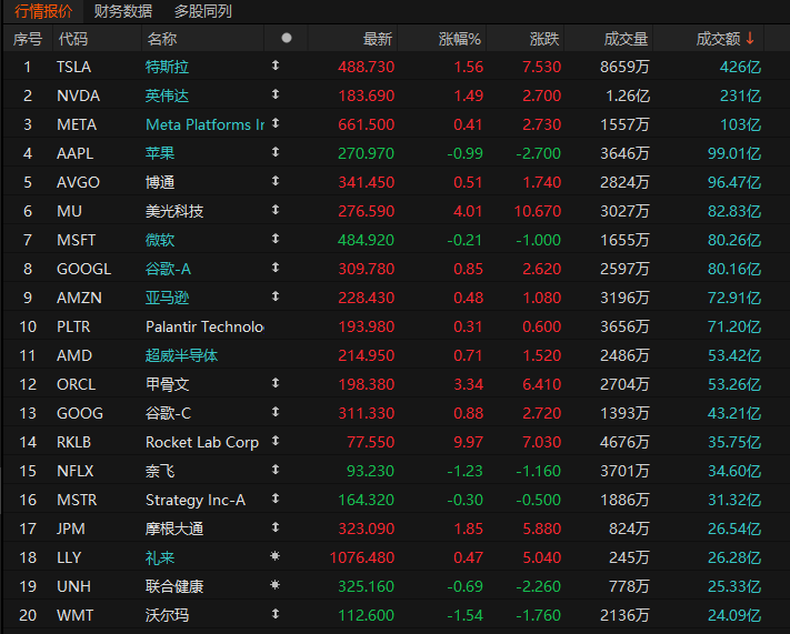 周一美股成交额第1名特斯拉收高1.56%,成交426亿美元。周一盘中,特斯拉股价一度上涨至498.83美元,创盘中历史新高。