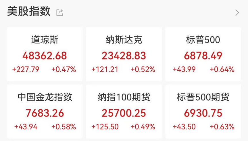 截至当日收盘,道指收涨227.79点,涨幅0.47%,报48362.68点;纳指收涨121.21点,涨幅0.52%,报23428.83点;标普500指数收涨43.99点,涨幅0.64%,报6878.49点。