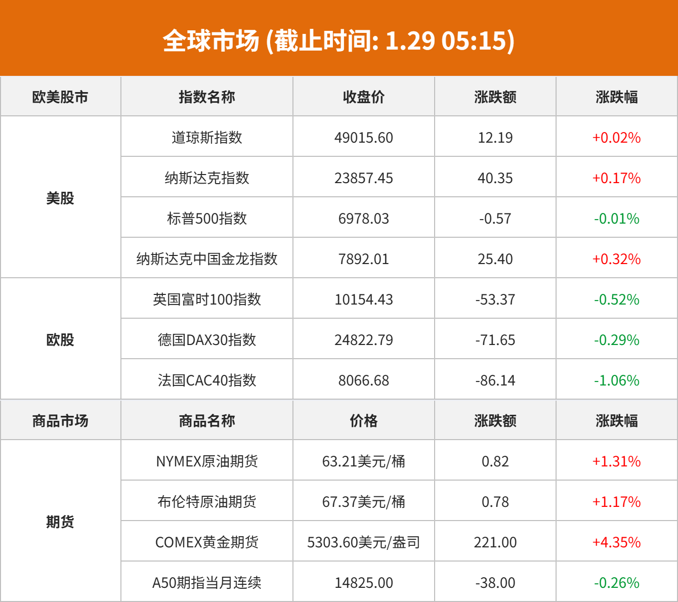 商品市场:贵金属牛市继续,金价大涨续创新高。COMEX黄金期货当月连续合约上涨328.40美元,涨幅6.46%,报5411.0美元/盎司。COMEX白银期货当月连续合约上涨10.66美元,涨幅10.06%,报116.62美元/盎司。现货黄金上涨235.54美元,涨幅4.55%,报5417.32美元/盎司。现货白银上涨4.67美元,涨幅4.16%,报116.81美元/盎司。国际油价01月28日上涨。截至当天收盘,纽约商品交易所WTI原油期货当月连续合约上涨1.11美元,收于每桶63.5美元,涨幅为1.78%。