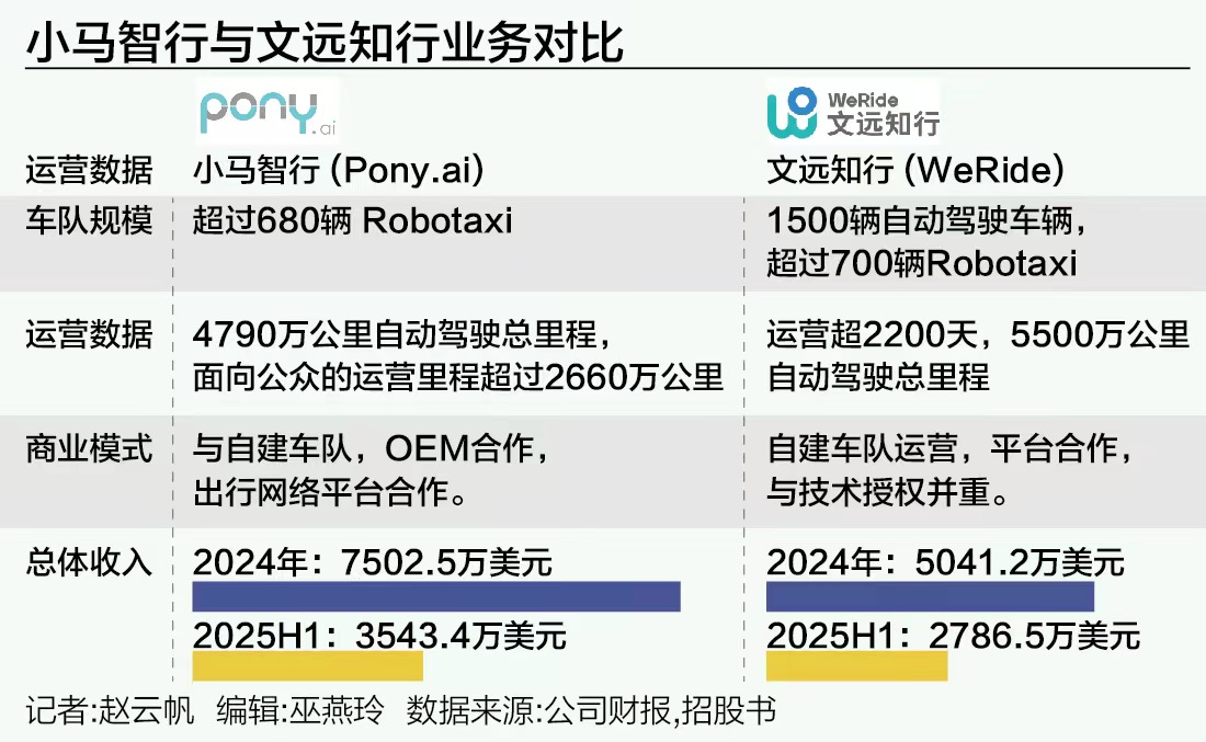 “巧合”数字的背后,两家 Robotaxi 资本化和市场化进程可谓长期并驾齐驱。2024年10月,文远知行率先在纳斯达克市场完成上市;同年11月,小马智行也正式完成纳斯达克市场登陆。
