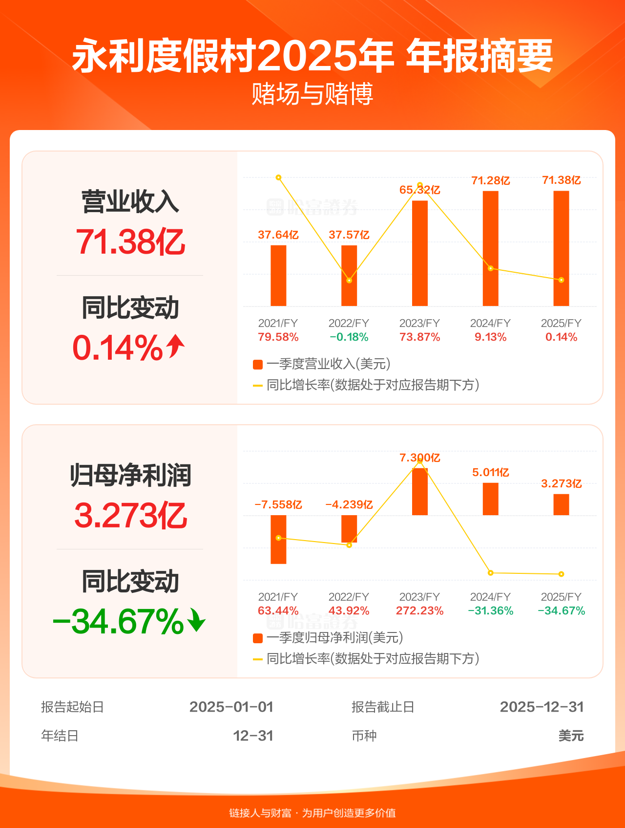 永利度假村2月12日发布年报业绩,截至2025年12月31日的12个月内,该公司营业收入71.38亿美元,同比增长0.14%;公司权益持有人应占溢利(归母净利润)3.27亿美元,同比减少34.67%。