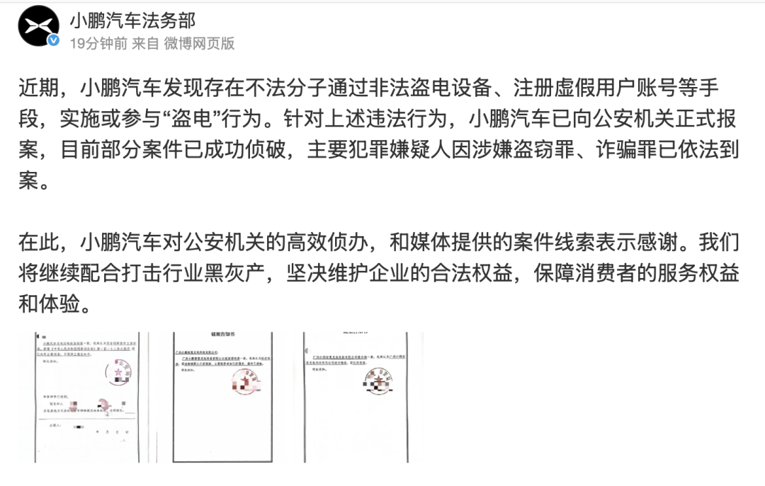 小鹏汽车严正打击非法盗电等黑灰产违法行为
